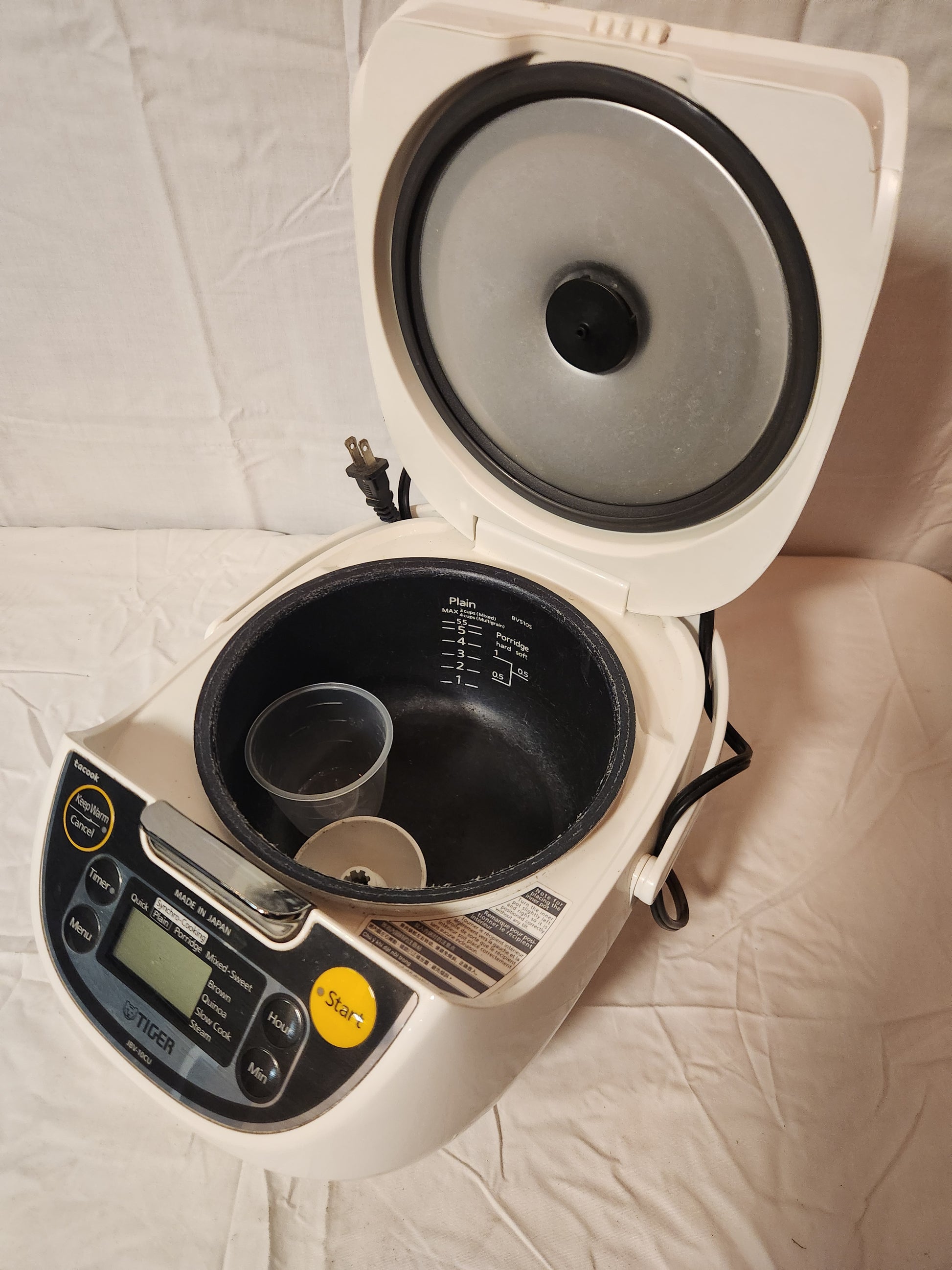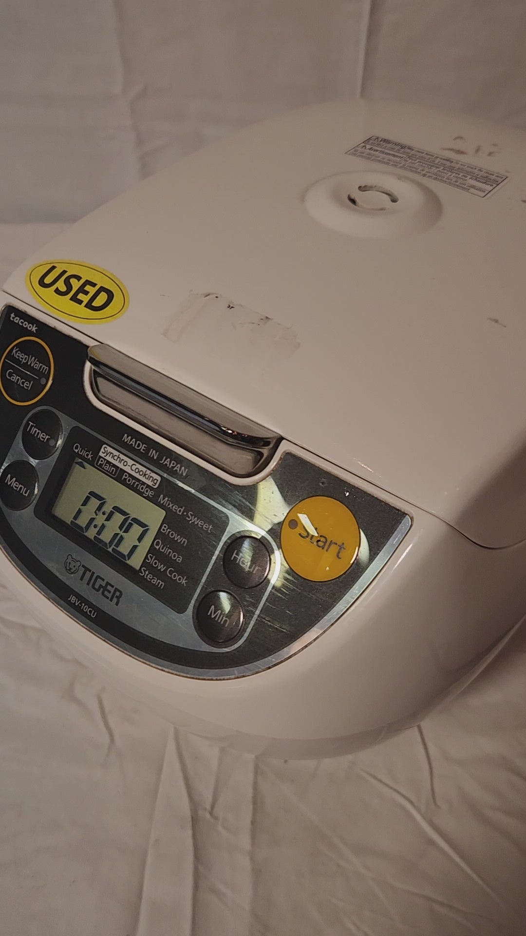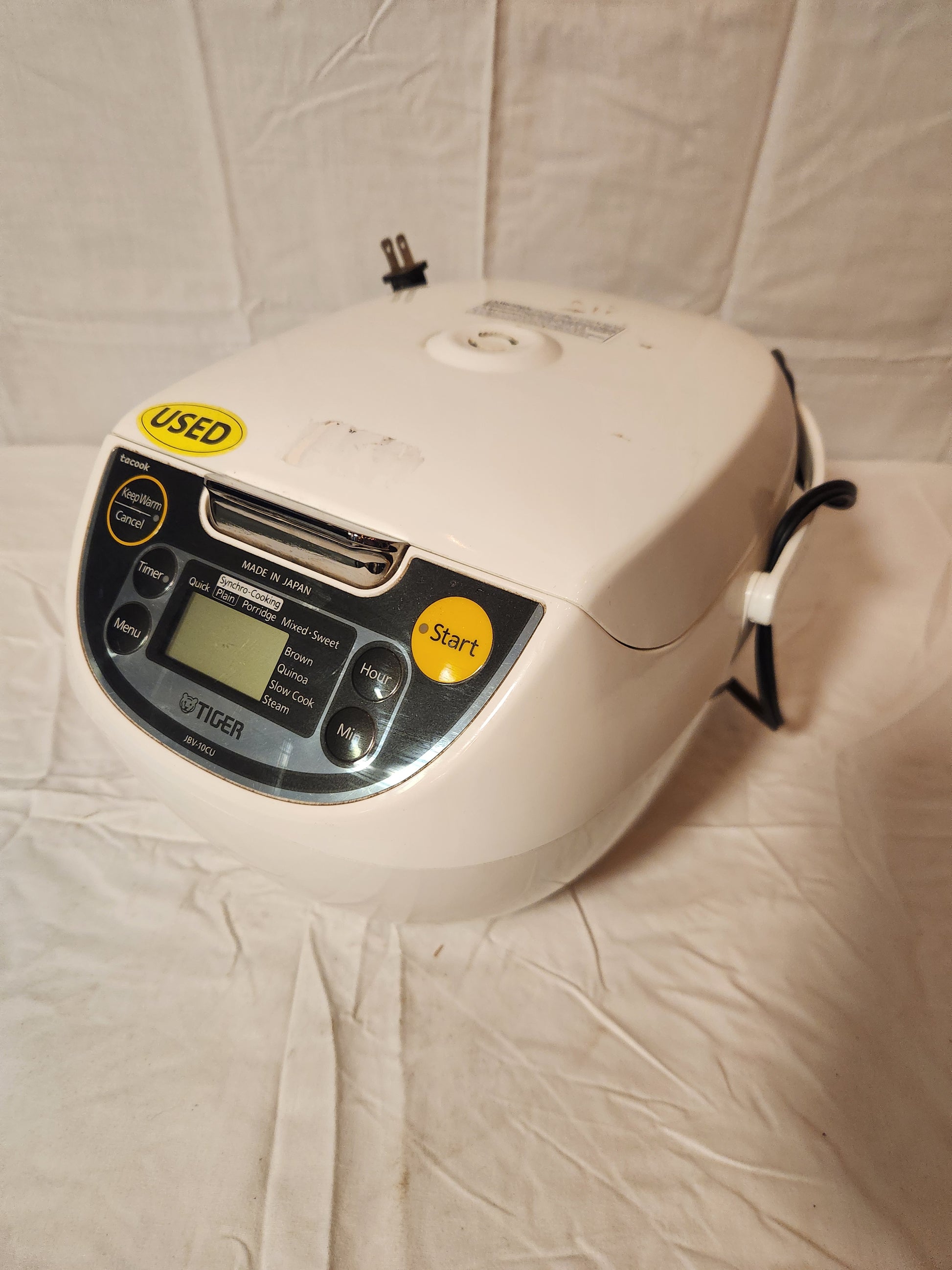 Note on Condition: This cooker is in USED condition. Please review all photos for the cosmetic wear, including the "USED" sticker on the front panel and remnants of other stickers. Functionally, it has been tested and works great. It does not include the original inner cooking plate ("Tacook plate") or measuring cup/spatula, so you will be purchasing the main cooker unit only.